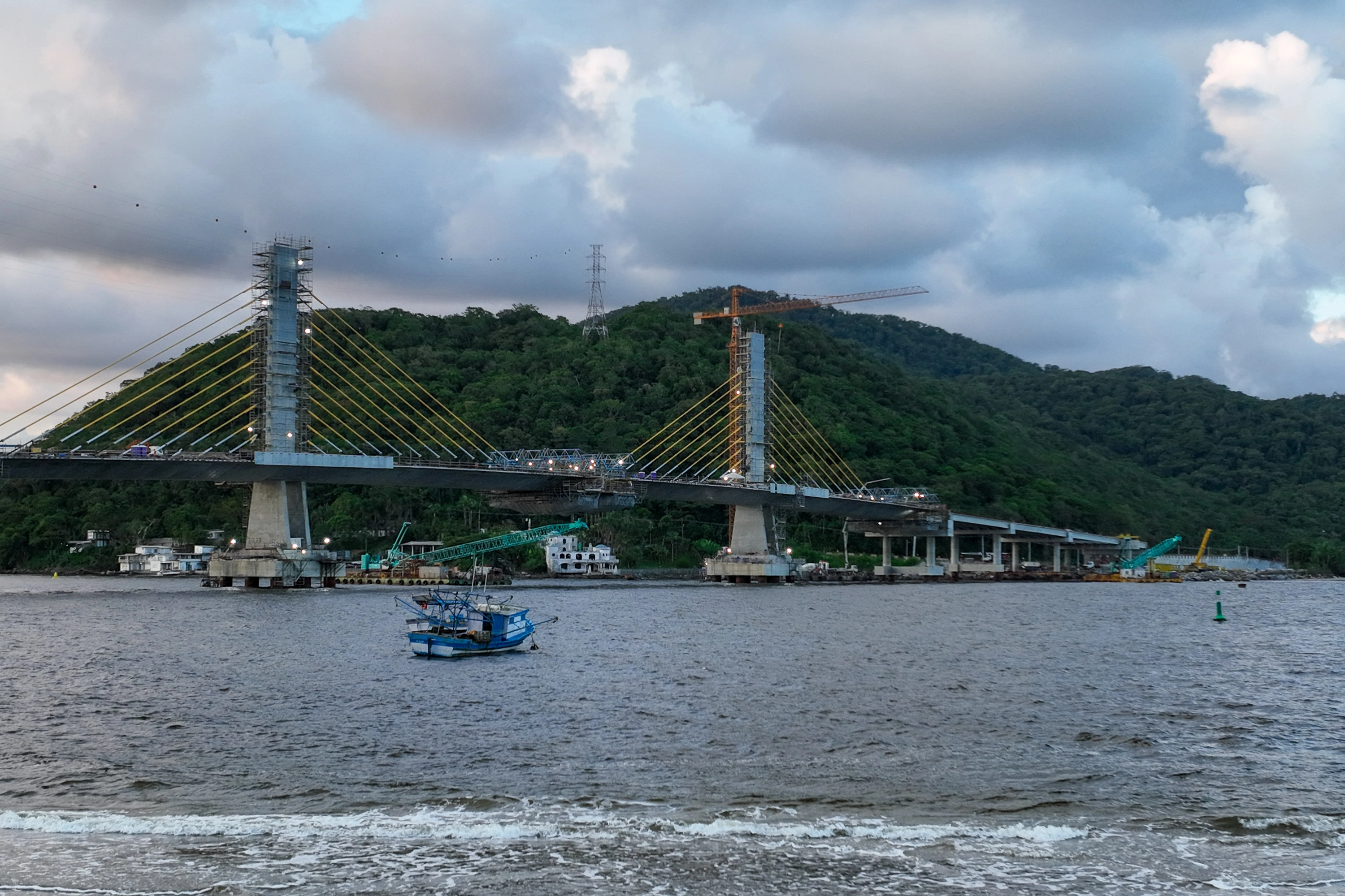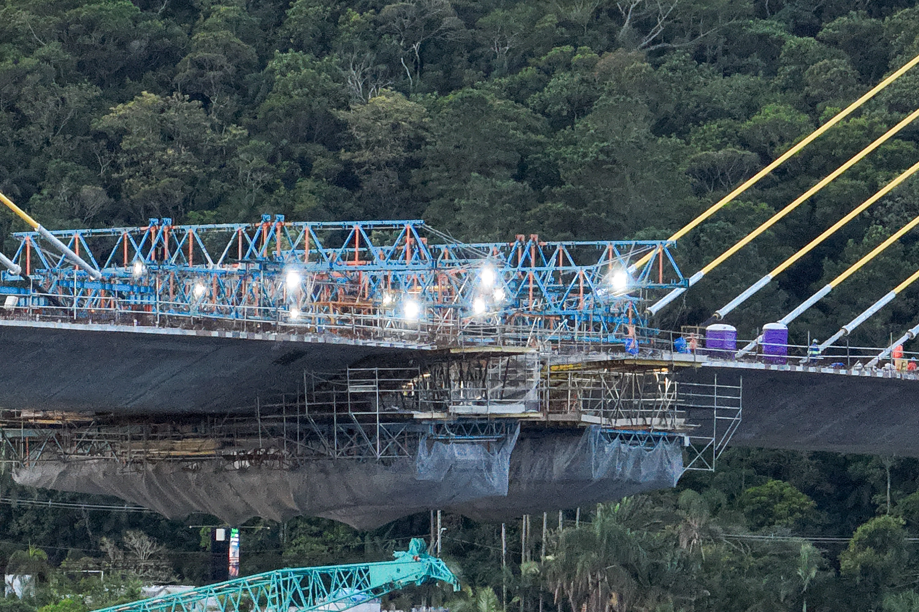 A instalação dos estais — cabos responsáveis pela sustentação da estrutura estaiada — segue em ritmo acelerado.